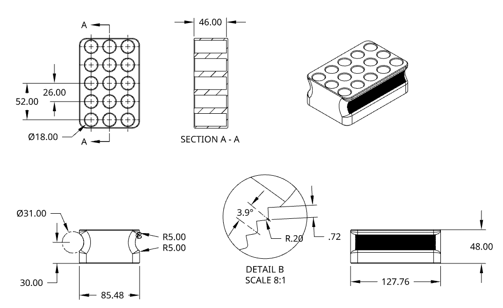 The wells feature a countersunk entry with a conical profile that matches standard 5 mL centrifuge tubes, maximizing contact area for efficient heat transfer and making it easy to insert tubes with one hand.