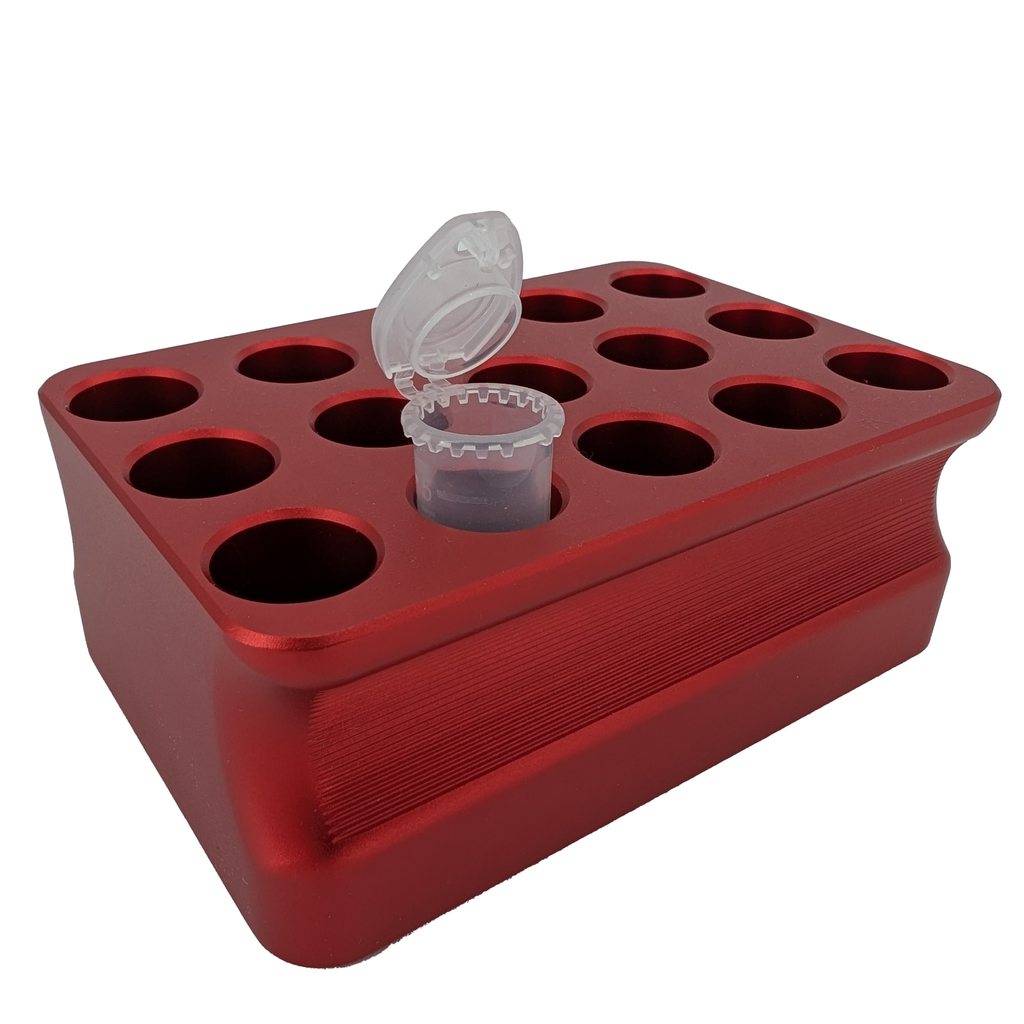 Pre-chill the cold block in a freezer or on ice and use it instead of an ice bucket for experiments that require low temperatures. The solid aluminum mass provides excellent thermal inertia — once chilled, the block keeps tubes cold significantly longer than plastic racks or ice buckets, with uniform temperature across all 15 positions.